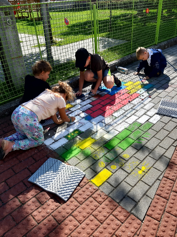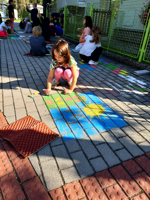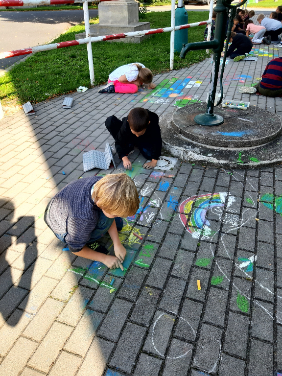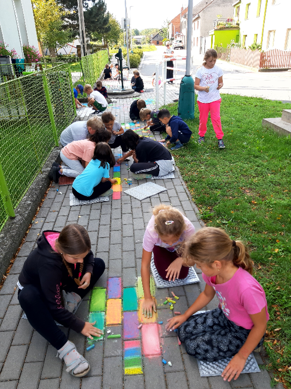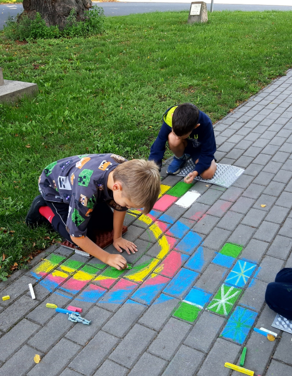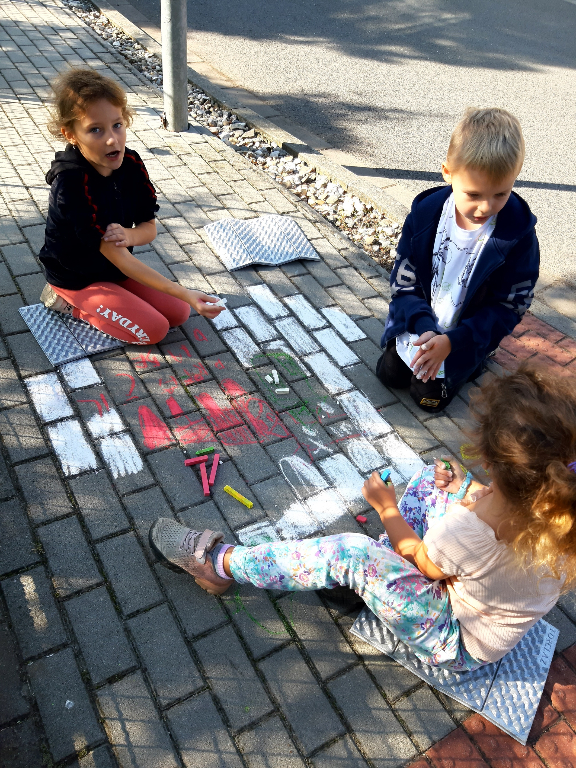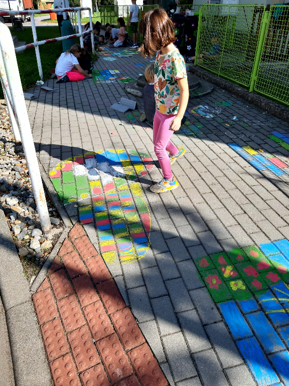 V den podzimní rovnodennosti děti svými obrázky vyzdobily chodník před školou a pozdravily odcházející léto.