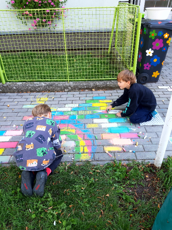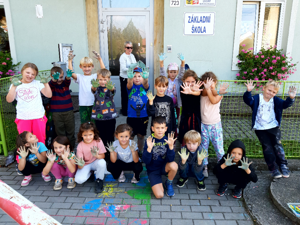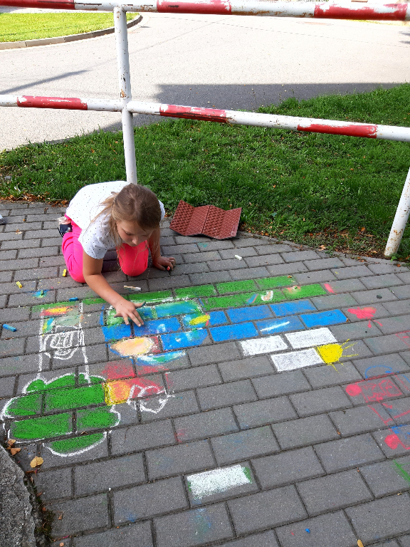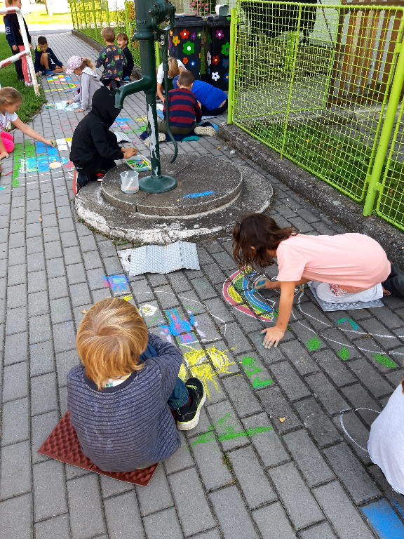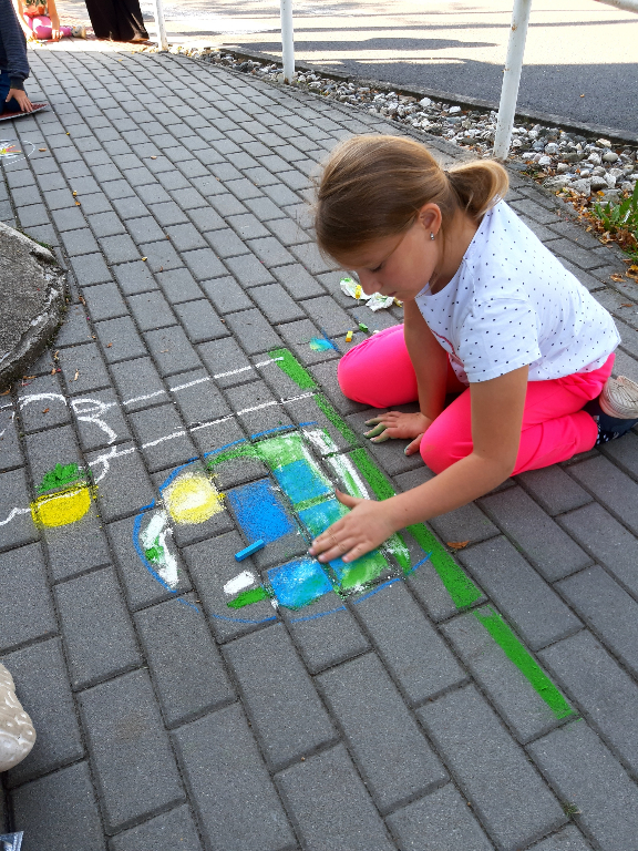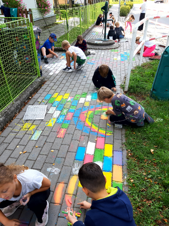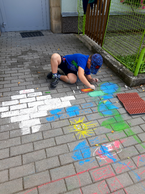 V den podzimní rovnodennosti děti svými obrázky vyzdobily chodník před školou a pozdravily odcházející léto.