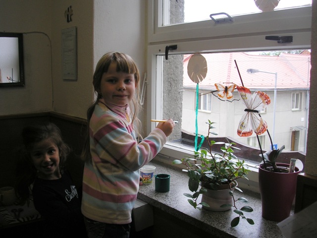 Fotky z odpoledne ve družině - stopy ve třídě, z procházky, na které děti vytvořily POZDRAV SLUNCI a zdobení školních oken.
