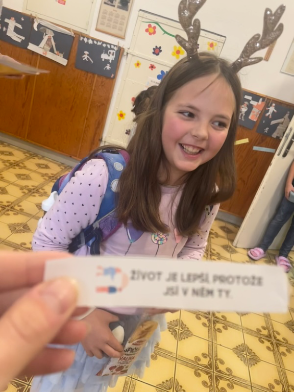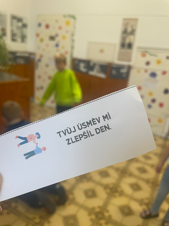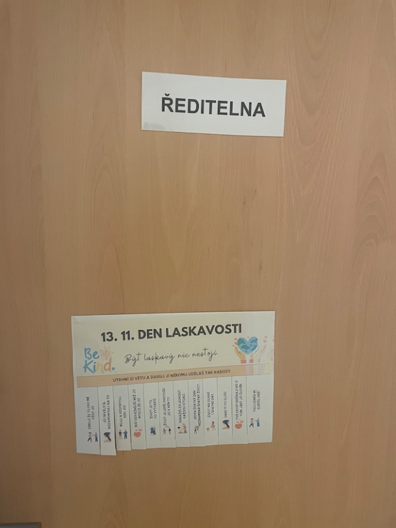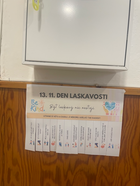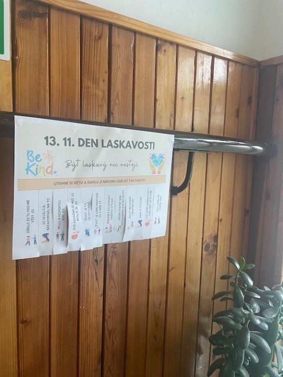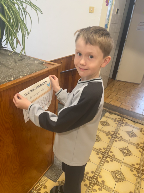 Dnes jsme společně rozdávali dobro a laskavost při příležitosti Dne laskavosti. Čtvrťáci po škole rozmístili pěkné vzkazy a my jsme se snažili se potěšit lidi kolem sebe milými větami na nich. Zjistili jsme, že i maličkost může druhému zpříjemnit den a šířit dobrou náladu.