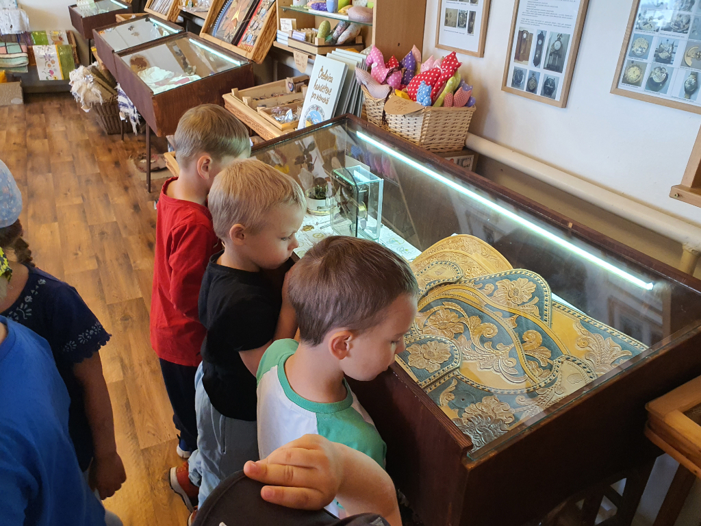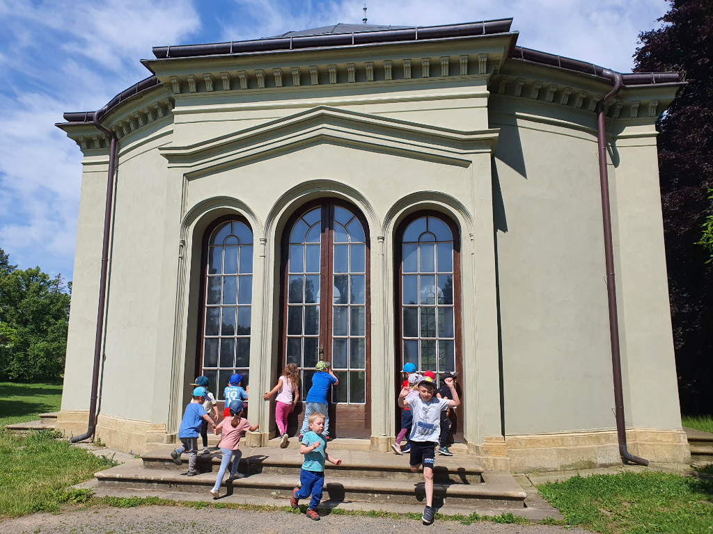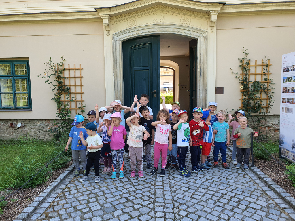 ☀️ Sláva nazdar výletu, nezmokli jsme, už jsme tu☀️ A moc jsme si to užili. Prvním zážitkem byla pro děti cesta "vláčkem", který nás dovezl k zámku v Čechách pod Kosířem, kde nás přivítali manželé Sýkorovi. Nejprve nám paní Sýkorová povídala o tradičních řemeslech na Hanácká ambasáda , kde děti viděly jak ukázku hotových výrobků, tak nástroje, které jsou k vyrábění potřeba. Pak si každý vymaloval svého motýlka. Následovalo házení míčkem na cíl a hudebně zábavný program s panem Sýkorou. Po programu jsme se vydali na procházku parkem zámku v Čechách pod Kosířem, při které jsme našli jeskyni s drakem, princeznovskou věž a spoustu jiných zajímavostí. Ještě jsme stihli rychle namalovat obrázky křídou na nádvoří před Hanáckou ambasádou na rozloučenou s paní Sýkorovou a panem Sýkorou a tradá vláčkem zpátky ke školce.